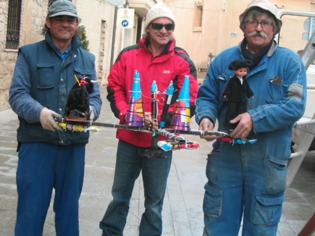 Esta foto esta echa el día 22 de Enero de 2013, en ella podemos ver a unos operarios del Ayuntamiento momentos antes de colocar el fuego de artificio, ese fuego todos los Oyoneses ya sabemos que es el torillo que se quema antes de entrar en la Iglesia después de la procesion en la que sacan a los Santos patrones, para los que no lo sepan consiste en el toro y un torero que empiezan a dar vueltas después de prenderles fuego hasta que uno de los dos explota, esta tradicion no se si he dicho alguna... Ahí tenemos esa rueda de artificio, que consiste en ese torero con el torillo y todos los explosivos que lleva consigo, nunca lo había visto tan cerca y les saque esta foto para tener un recuerdo de ese momento que fue cuando lo iban a subir a ese poste en el cual le prenderían fuego como todos los años mientras la procesión de los Patrones, ya habéis visto el funcionamiento del torillo en otras fotos que tenemos por ahí así que no os quiero molestar, lo que si es cierto de que esos tres muchachos...