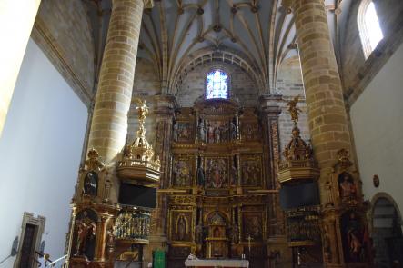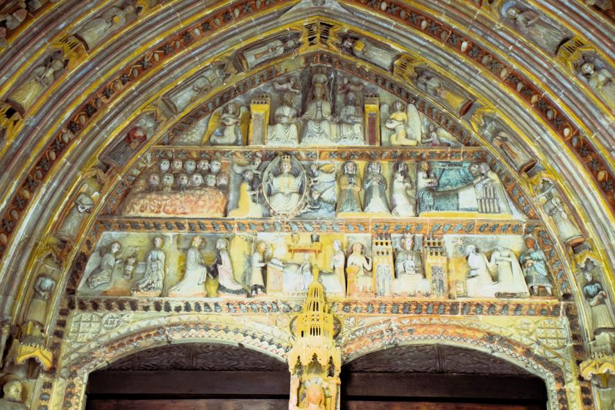 Tímpano partido en tres niveles de la portada de la parroquia de Santa María,