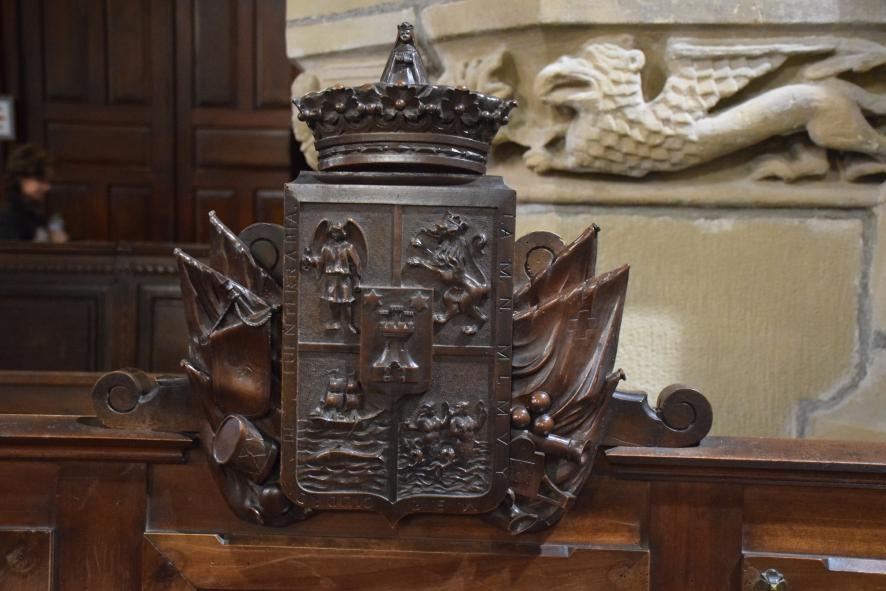 Escudo tallado en un banco de madera de la iglesia parroquial de Santa María de la Asunción,