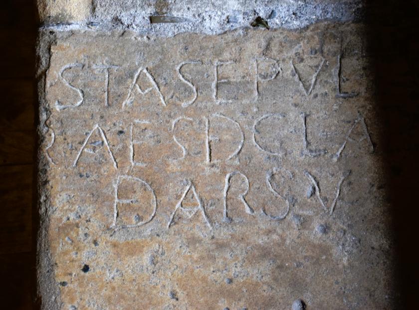 Inscripción en una piedra del suelo de la iglesia de Santa María de la Asunción,
