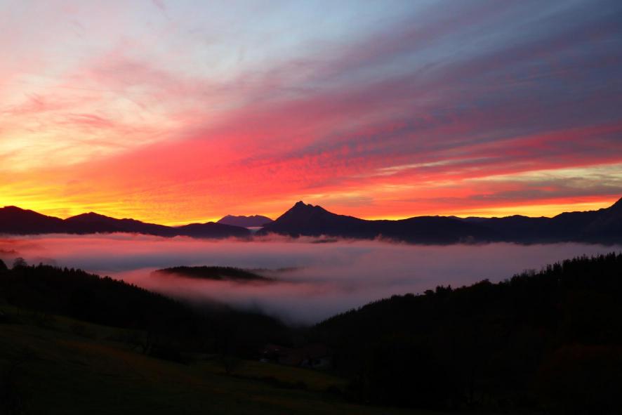 Amanecer con el cielo rojo y nubes bajas,