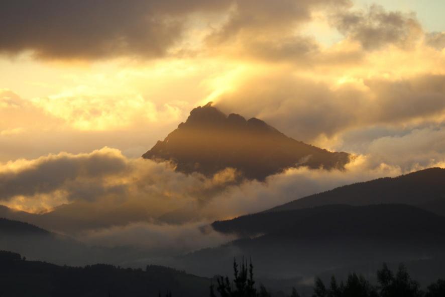 El monte Udala surge entre nubes al amanecer,