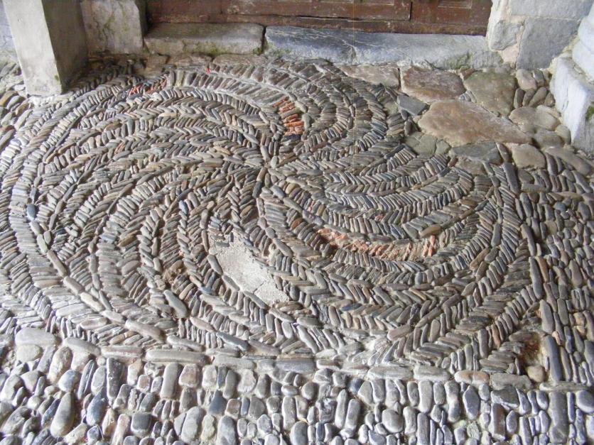 Mosaico de piedras a la entrada de la iglesia,